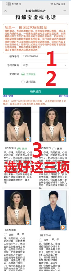 答:下单和解宝电话只需要三个步骤:一是选择你觉得合适的话术,在该话术编号后面点选择,第二步填写被叫的对方号码和归属省份,选择立即发送或者定时发送设好时间,第三步点确定提交,然后会自动跳转到和解宝电话消费记录页面,如果对方接听了电话等三分钟左右即可收听该段录音,洞察对方的反应。